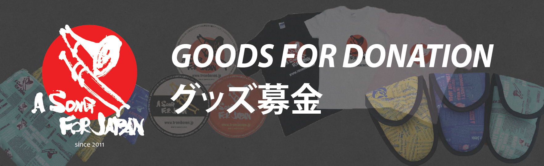 A SONG FOR JAPANプロジェクトでは、2011年4月より「グッズ募金」と題して、Tシャツ・ステッカーなどを製作・販売し、その利益の全額を日本赤十字社にお送りしています。